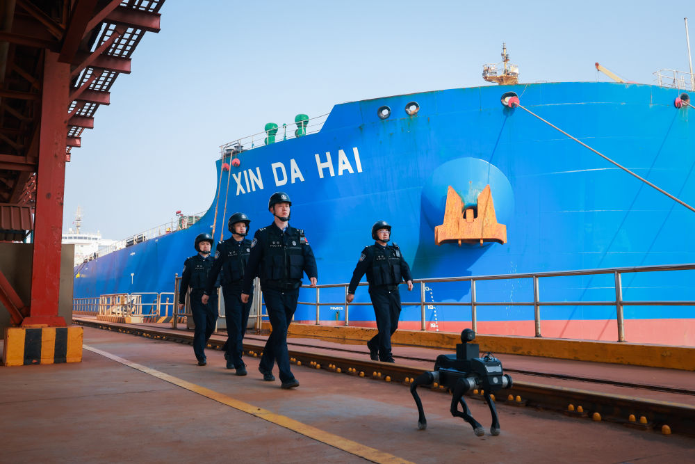 2026年4月2日,山东边检总站董家口边检站启用四足机器东说念主开展港区梭巡,以科技强警普及管控服从。(受访者供图)