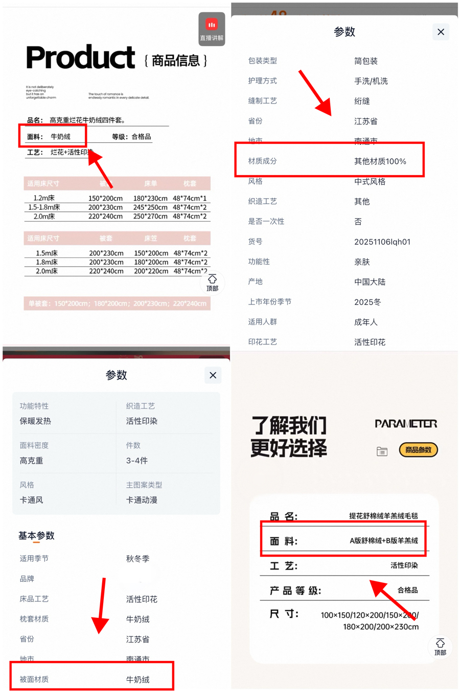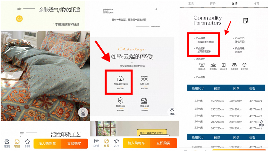 记者调查也发现,床上用品“玩概念”的问题在电商平台尤其突出。在线下市场,消费者不仅能触摸到产品,还可以当场查看商品的详情标签或水洗标。对规范上市的产品来说,这些标签上都必须具备规范的纤维名称。但在电商平台,绝大多数商家没有在产品介绍页面提供产品详情标签、水洗标的照片;而在介绍“面料详情”时,要么用商品推广名称代替规范的纤维名称,要么用“其他纤维”等字眼敷衍。也正因为此,很多消费者被误导。
