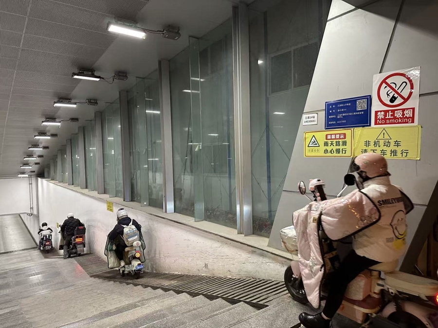 “现在天气冷了,谁还愿意下来推车?费劲死了。”一位正准备骑车下坡的外卖小哥一边说,一边熟练地拧动把手,“我技术好,没事的。”话音未落,他便如离弦之箭般冲了下去,只留下一串刺耳的刹车声在地道中回荡。在记者观察的15分钟内,无一名骑车人遵循安全规则选择下车推行。