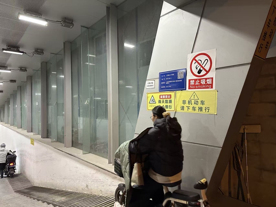 据刘先生讲,三泉路地道是周边居民通勤、买菜、接送孩子的必经之路。记者在现场看到,地道出入口的坡道较为陡峭,尽管在坡道的显眼位置,竖立着蓝底白字的交通标志,清晰地写着“非机动车请下车推行”,但这些警示仿佛成了“摆设”。