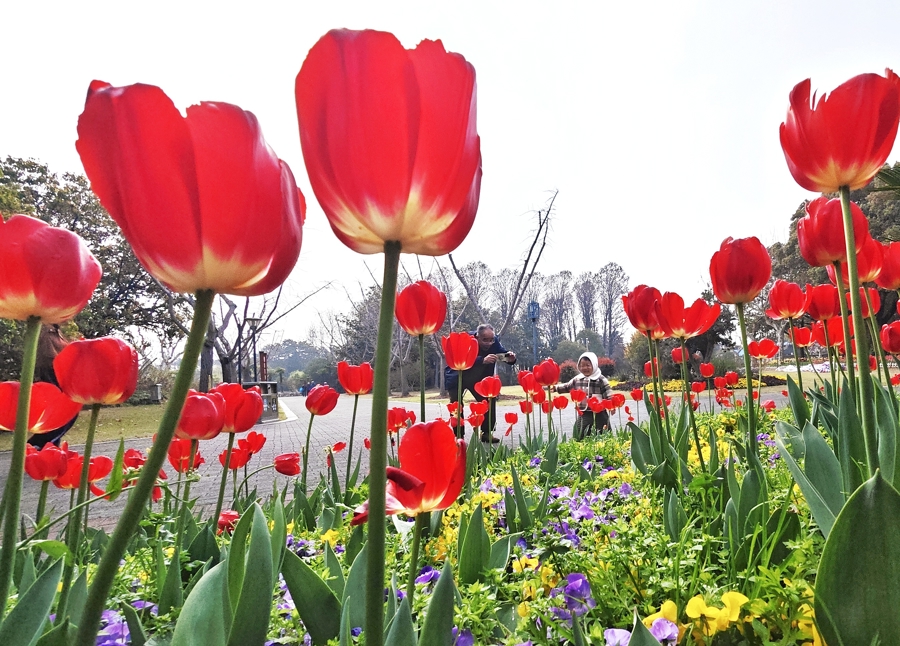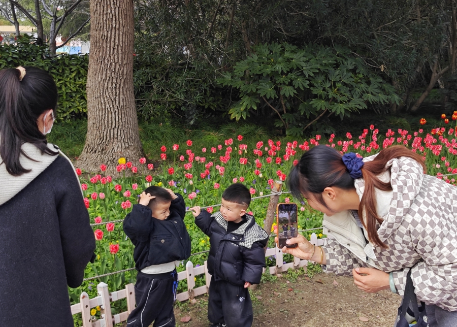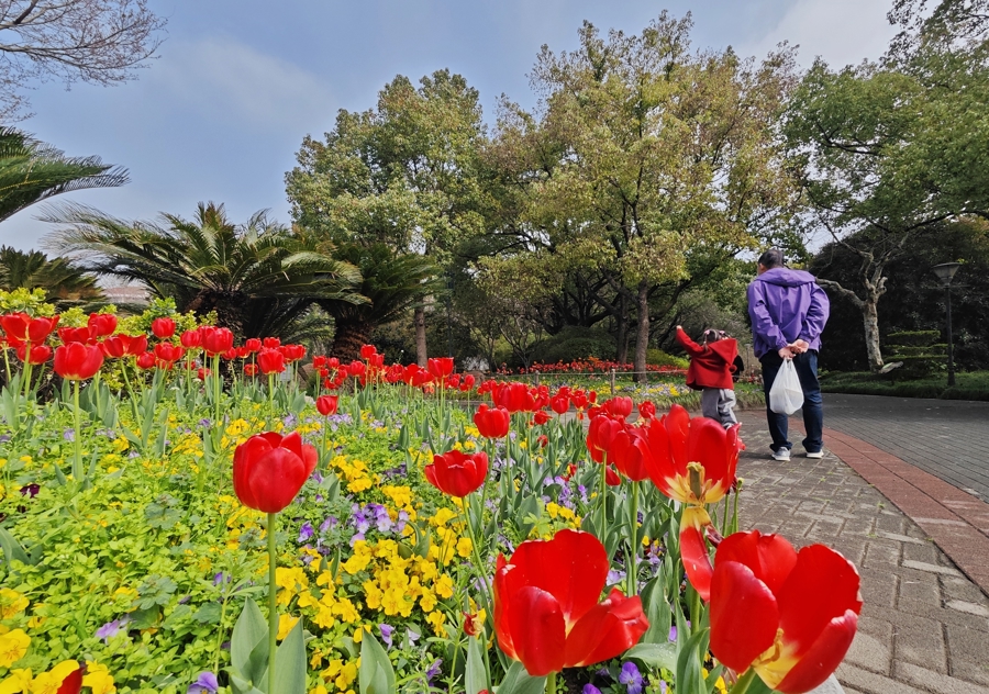 滨海公园近日迎来了一年中最好意思艳的时刻。园内1.8万余株、5个品种郁金香交汇成色调斑斓的画卷。
