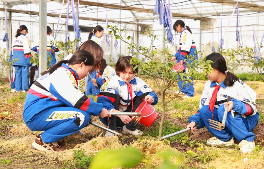 3月25日下昼,在金山区金山卫镇横召村的善晨果蔬赞成专科迷惑社,来自金盟中学的300多名学生过问了一场探寻春天的研学步履。