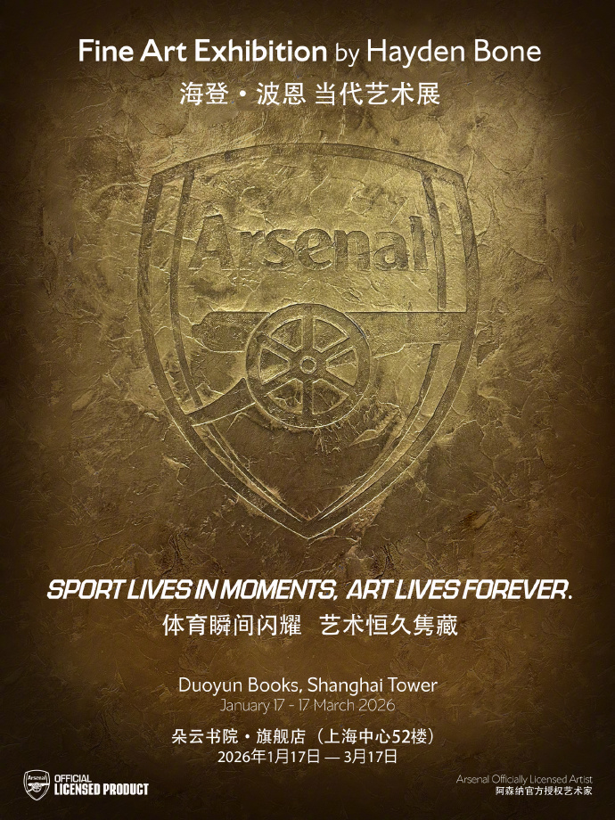 1 月 24 日,阿森纳足球俱乐部成立 139 年来首次官方授权的全球艺术展第一站,落地中国上海。在上海中心大厦 52 层的朵云书院・旗舰店内,精心布置的限量版展品涌动着激情满满的 “枪手元素”,这些艺术画作巧妙凝固足球运动的美妙瞬间,吸引全国各地的 “枪迷” 集体感受足球激情、艺术魅力的交织融合。