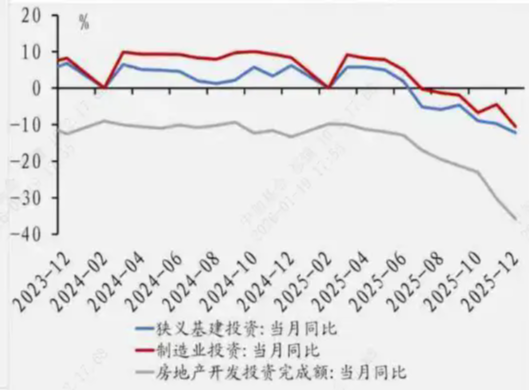 12月固定资产投资累计同比增速12月继续下滑至-3.8%。同样低于市场预期。分项看,三大主要分项投资增速均继续下滑:房地产开发投资累计同比-17.2%(当月同比-35%),广义基建累计同比-1.48%(当月同比-16.01%),制造业累计同比0.6%(当月同比-10.55%),后续,基建投资仍将以两重项目和新兴产业项目为主,低基数下有望逐渐企稳。而制造业可能继续受到反内卷政策的压力。市场对于地产政策出台的预期有所增加。