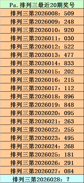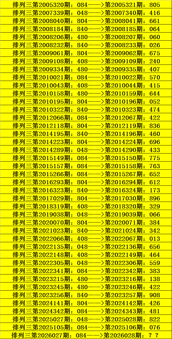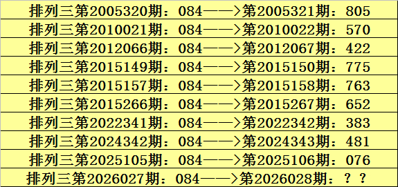 第2026027期排列三奖号为084,历史上该号码直选出现10次,下期奖号分别为:805、570、422、775、763、652、383、481、076。