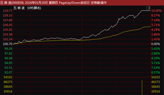 市场热点方面,午后大盘蓝筹股集体异动拉升,白酒股表现最为活跃,板块指数单边上扬大涨5.53%,创1年多来最大涨幅,成交较昨日激增1倍多。五粮液(000858)临近收盘最后15分钟涨停,伊力特、酒鬼酒、洋河股份、泸州老窖等超20股午后涨停。