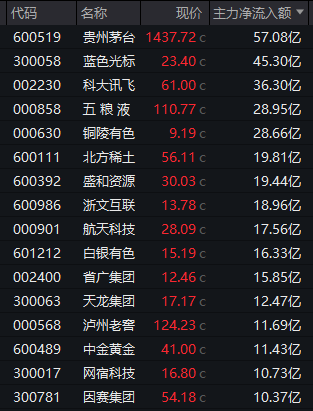 个股方面,蓝色光标获得逾45亿元净流入,科大讯飞获得逾36亿元净流入,五粮液、铜陵有色均获得超20亿元净流入,北方稀土、盛和资源等11股也获得超10亿元净流入。